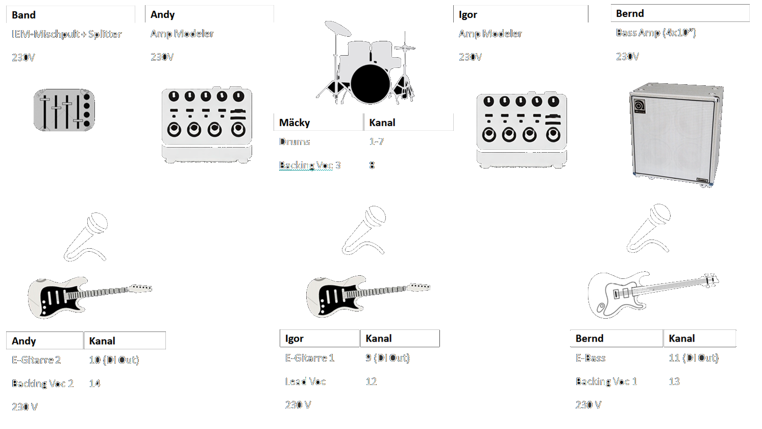 Diese Kanalbelegung gibt das Routing innerhalb des In-Ear Mischpults wieder. Durch die Splitter kann die Belegung auf dem Hauptmischpult allerdings frei gewählt werden. Es ist hier natürlich auch möglich nur einzelne Kanäle weiterzuleiten. Die Mikrofone werden von der Band gestellt.